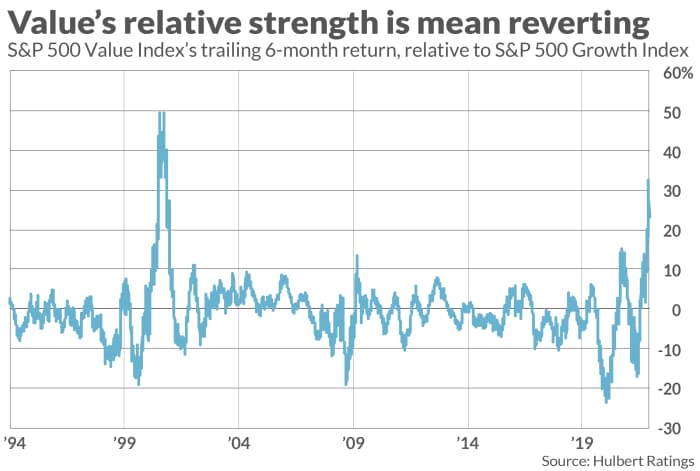 As the chart also shows, value’s trailing-6-thirty day period relative energy does not are inclined to persist. If nearly anything, the relative energy line plotted in the chart seems to be additional mean-reverting than trend subsequent. That is why you are on shaky ground contemplating that, just mainly because value has accomplished so nicely about the very last 6 months, it has enhanced odds of continuing to do so.